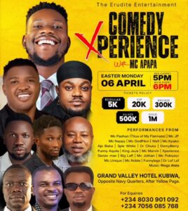 Comedy Xperience with Mc Apapa is scheduled for Easter Monday at Grand Valley Hotel, organizers said. Red‑carpet arrivals begin at 5 pm; the show starts at 6 pm. Apapa will host a lineup that includes Mc Pashun (Titus from “My Flatmate”), Mc Jp, Aje Baba, Mc Nappy, Mc Kpako, Mc GodPikin and Min Suzie Oche-Otene (in music). Organizers promise “pure laughter” and local ribbing....